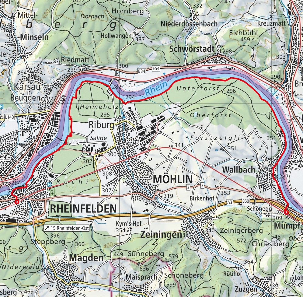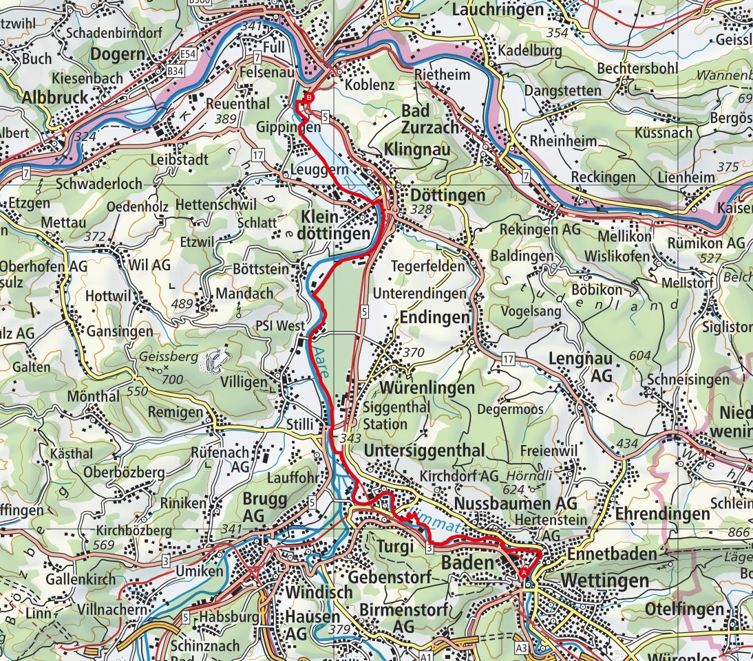 Baden - Nussbaumen AG - Obersiggingen - Turgi - Untersiggingen - Stroppel - Burgruine Freudenau - Siggenthal - KKW Beznau - Döttingen - Kleindöttingen - Klingnauer Stausee - Koblenz