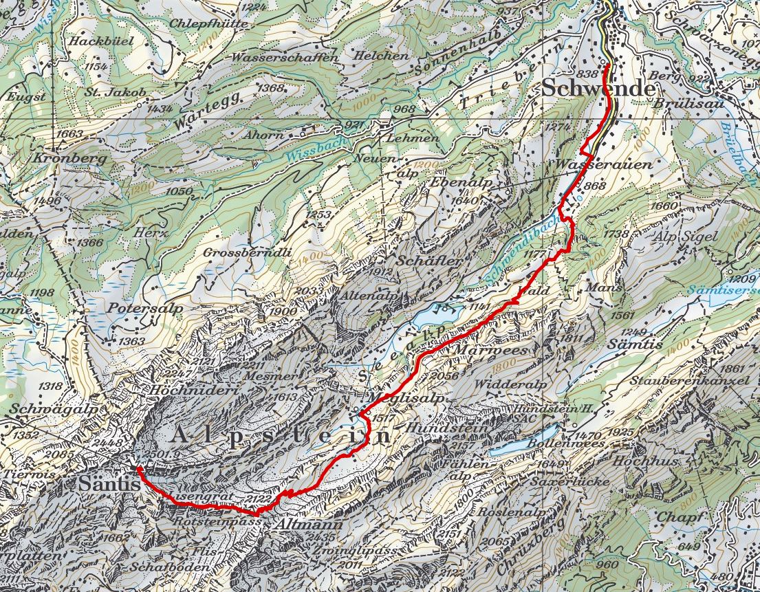 Schwende - Wasserauen - Hüttentobel - Meglisalp - Rotsteinpass - Lisengrat - Säntis