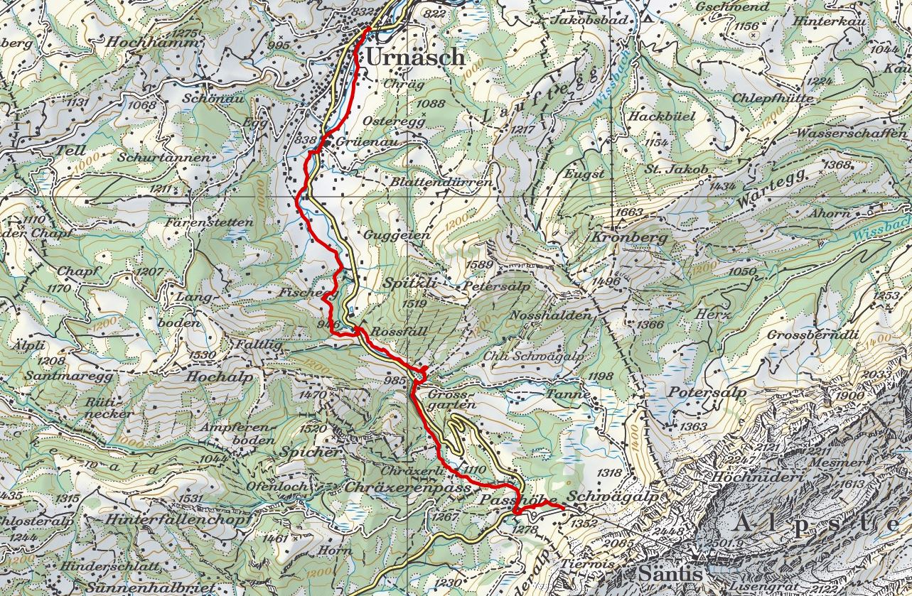 St. Peterzell - Neckerau - Schwandsbrugg - Starkenbach - Vordernecker - Hindernecker - Groppennecker - Ampferenboden - Cholwald - Chräzerenwald - Chräzerenpass - Schwägalp