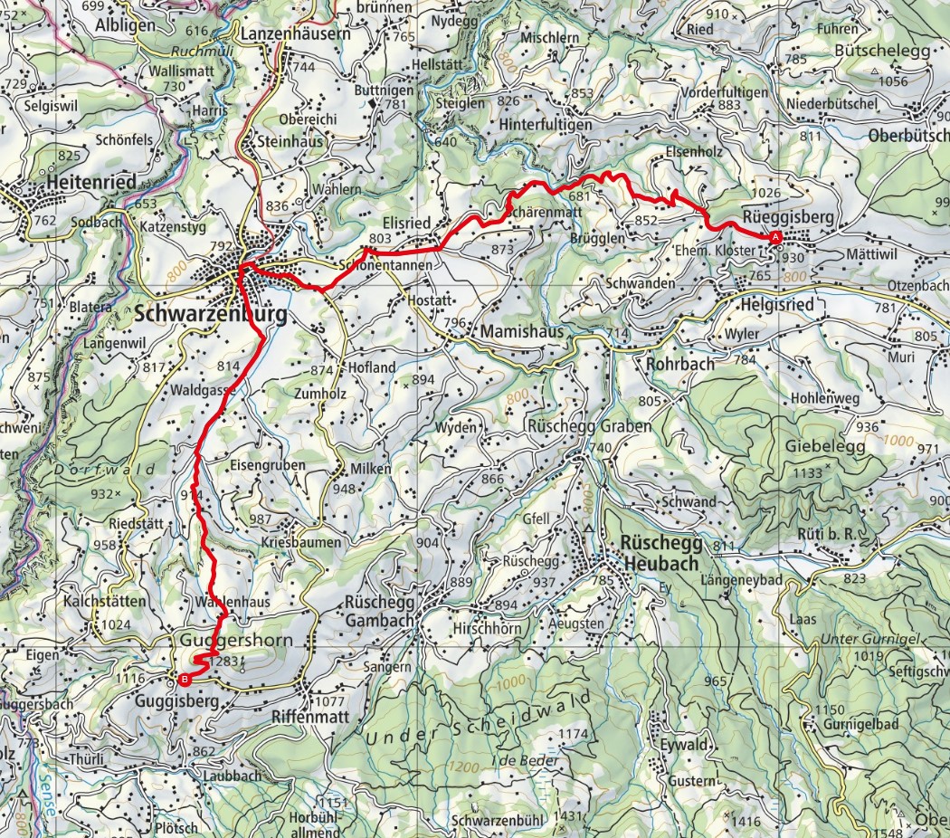 Rüeggisberg - Riedstettwald - Rossgraben - Elisried - Schönentannen - Zelg - Schwarzenburg - Eichmatt - Schiltberg - Wahlenhaus - Guggershorn - Guggisberg