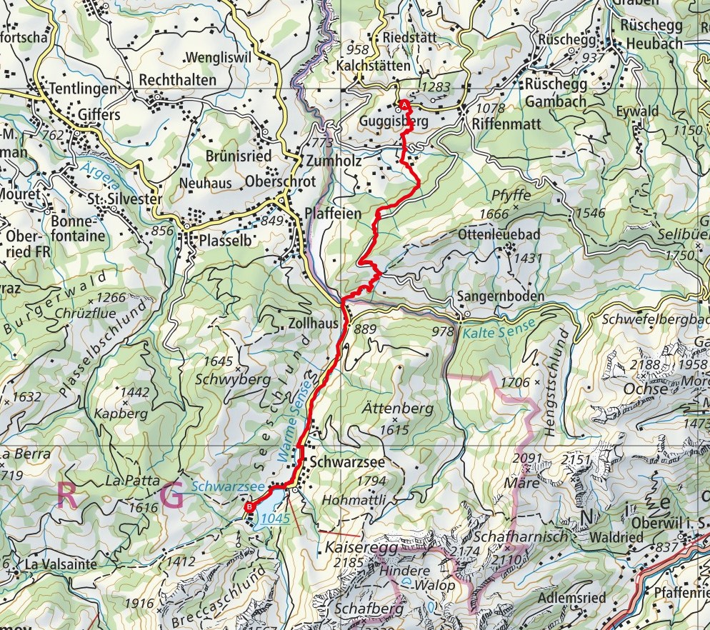 Guggisberg - Duftacker - Holzersflüeh - Laubbach - Aegerten - Bühlenhubel - Aegertenwald - Brandwald - Brönnti Egg - Martenen - Zollhaus FR - Sturnena - Rohrmatte - Brüggera - Schwarzsee - Bad Schwarzsee