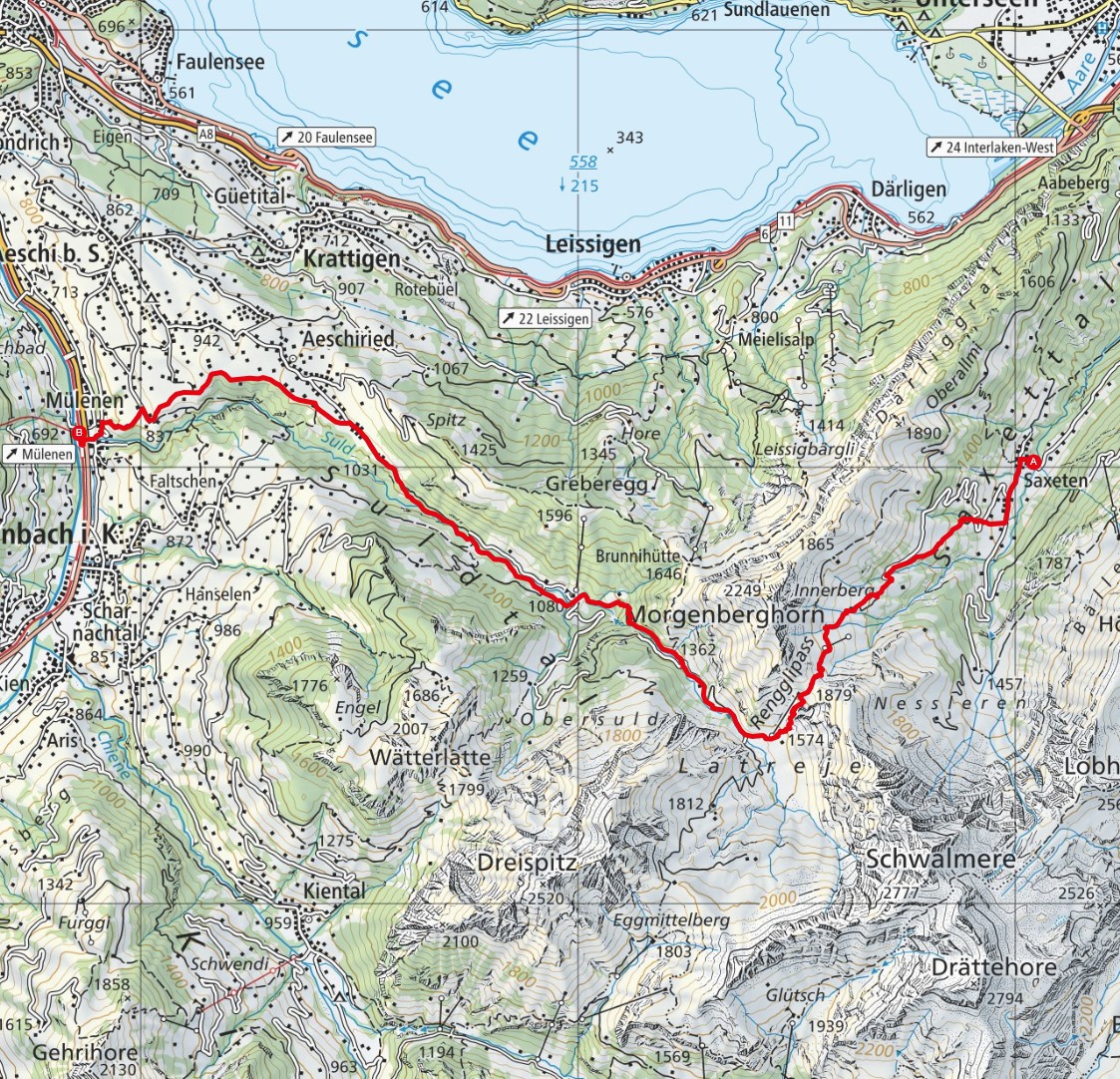 Saxeten - Innerfeld - Ramsermatten - Innerberg - Rengglipass - Mittelberg - Schlieri - Pochtenfall - Suldtal - Scheidmatten - Aeschiried - Feldmoos - Mülenen