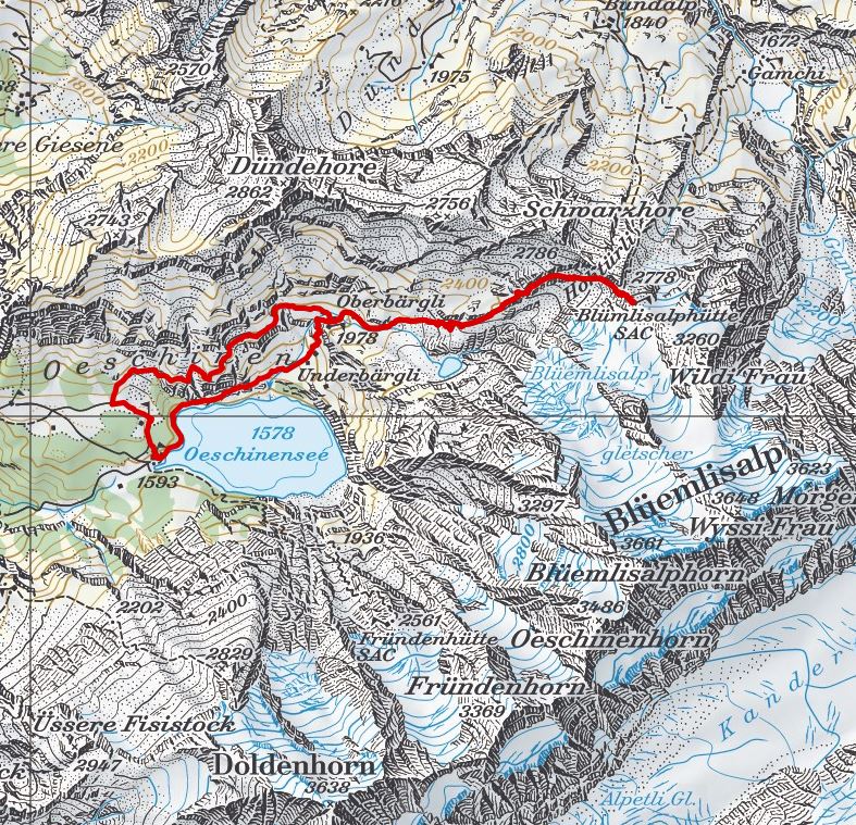 Berghotel Öschinensee - Underbärgli - Oberbärgli - Hohtürli - Blüemlisalphütte - Hohtürli - Oberbärgli - Panoramaweg Öschinensee - Berghotel Öschinensee