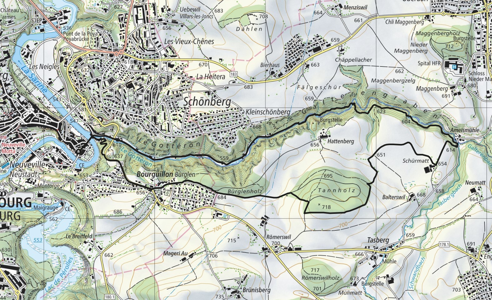 Fribourg - Sous-Dürrenbühl - Galterengraben - Rainholz - Ameismühle - Tannholz - Bourguillon - Lorette - Montorge - Neuveville - Fribourg