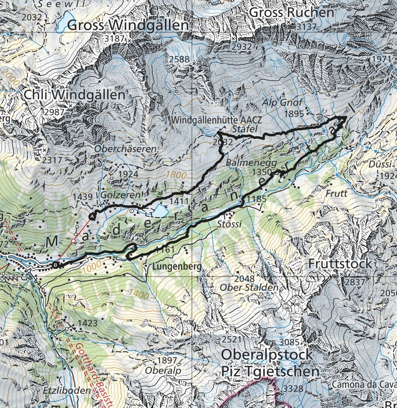 Bristen (Talstation Golzern) - Legni - Griesserenwald - Alp Stössi - Balmenegg - Sass - Tritt - Öfeli - Windgällenhütte - Schissenegg - Golzernsee - Seewen - Golzern (Bergstation)