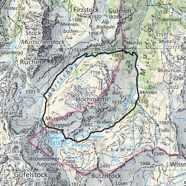 Merlen - Gspon - Unter Mürtschen - Ober Mürtschen - Murgseefurggel - Oberer Murgsee - Mittlerer Murgsee - Unterer Murgsee - Mornen - Merlen