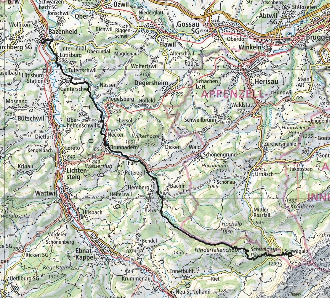St. Peterzell - Neckerau - Schwandsbrugg - Starkenbach - Vordernecker - Hindernecker - Groppennecker - Ampferenboden - Cholwald - Chräzerenwald - Chräzerenpass - Schwägalp