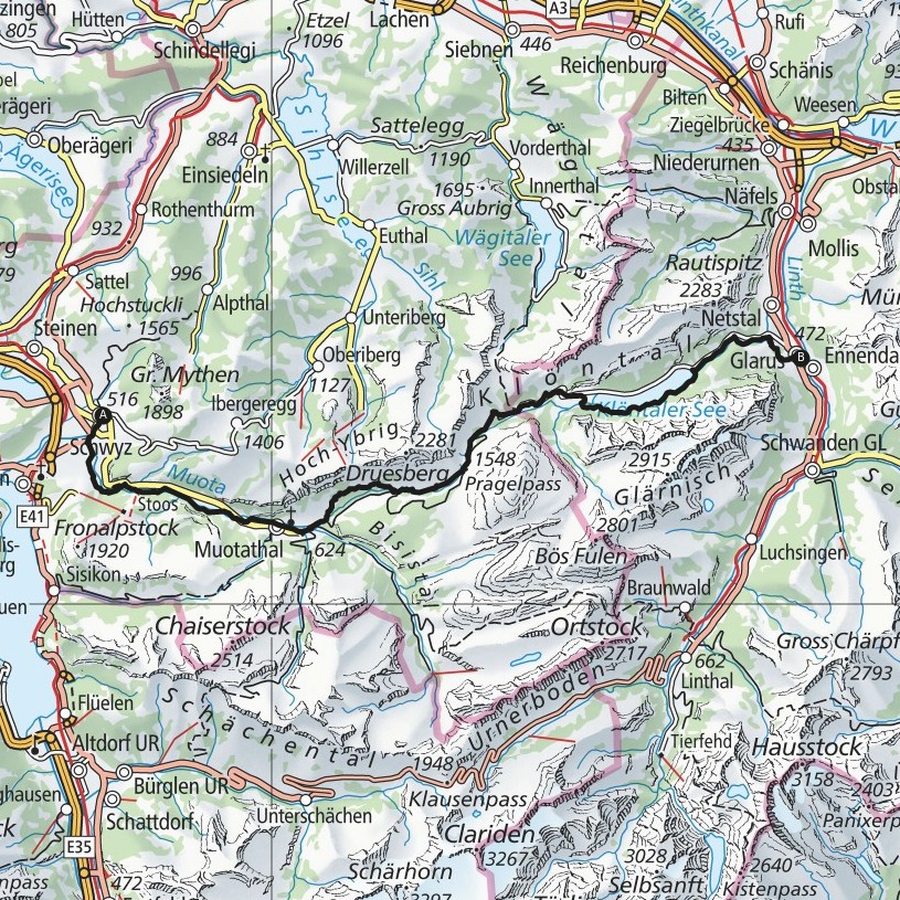 Schwyz - Hinteribach - Oberschönenbuch - Suworowbrücke - Stoosbahn - Ried - Vordere Brücke - Weid - Muotathal - Tschalun - Muotathal (Höllloch)