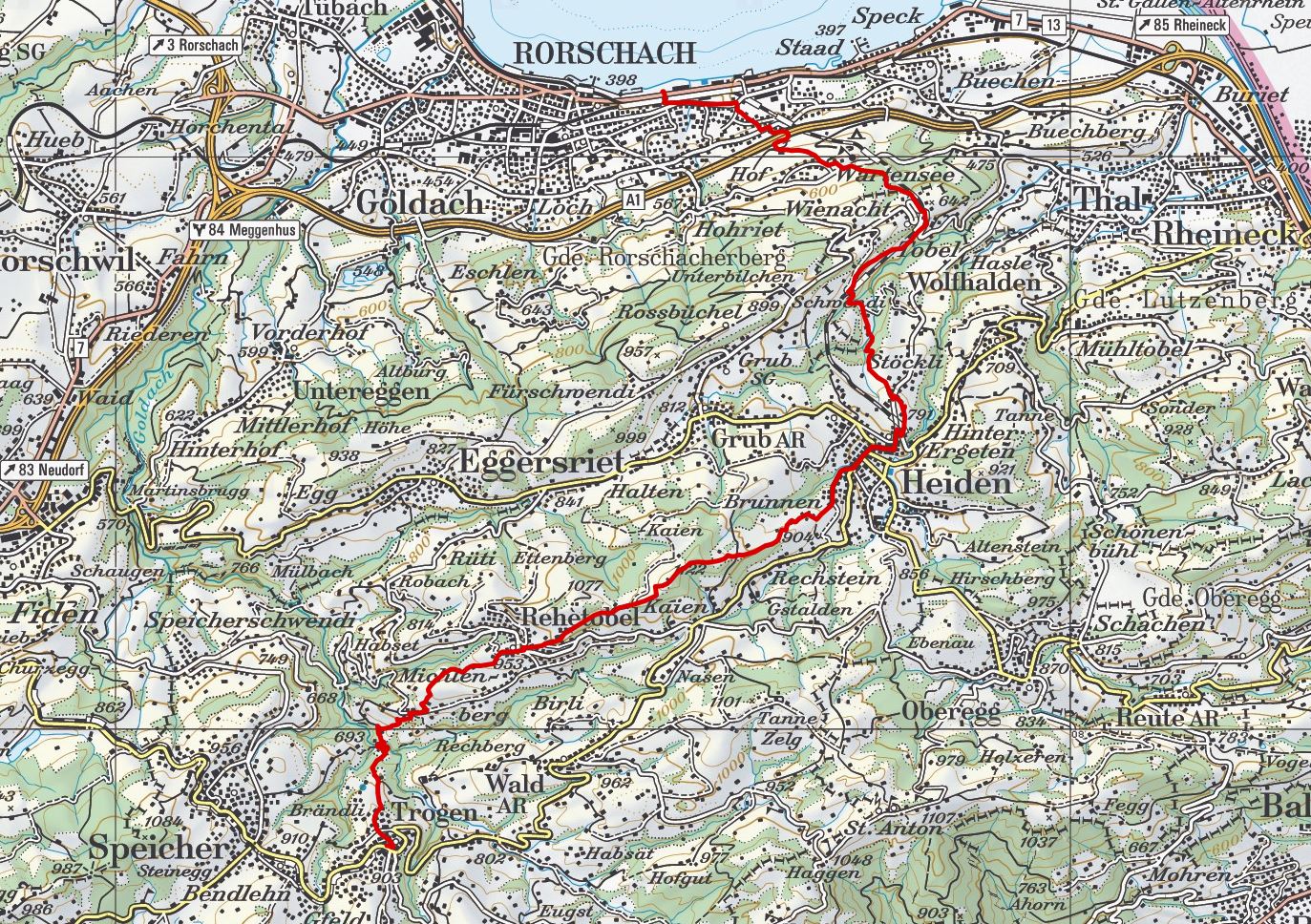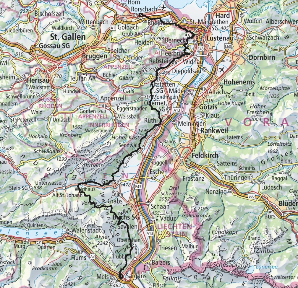 Sennwald - Britschli - Schwendi - Furnis - Plona - Ametschils - Rüthi - Rehag - Stieg - Kobelwald - Kristallhöhle - Kessiloch - Fuchsplatz - Hard - Oberau - Eichberg - Oberrüti - Brand - Krans - Rebhalde - Altstätten