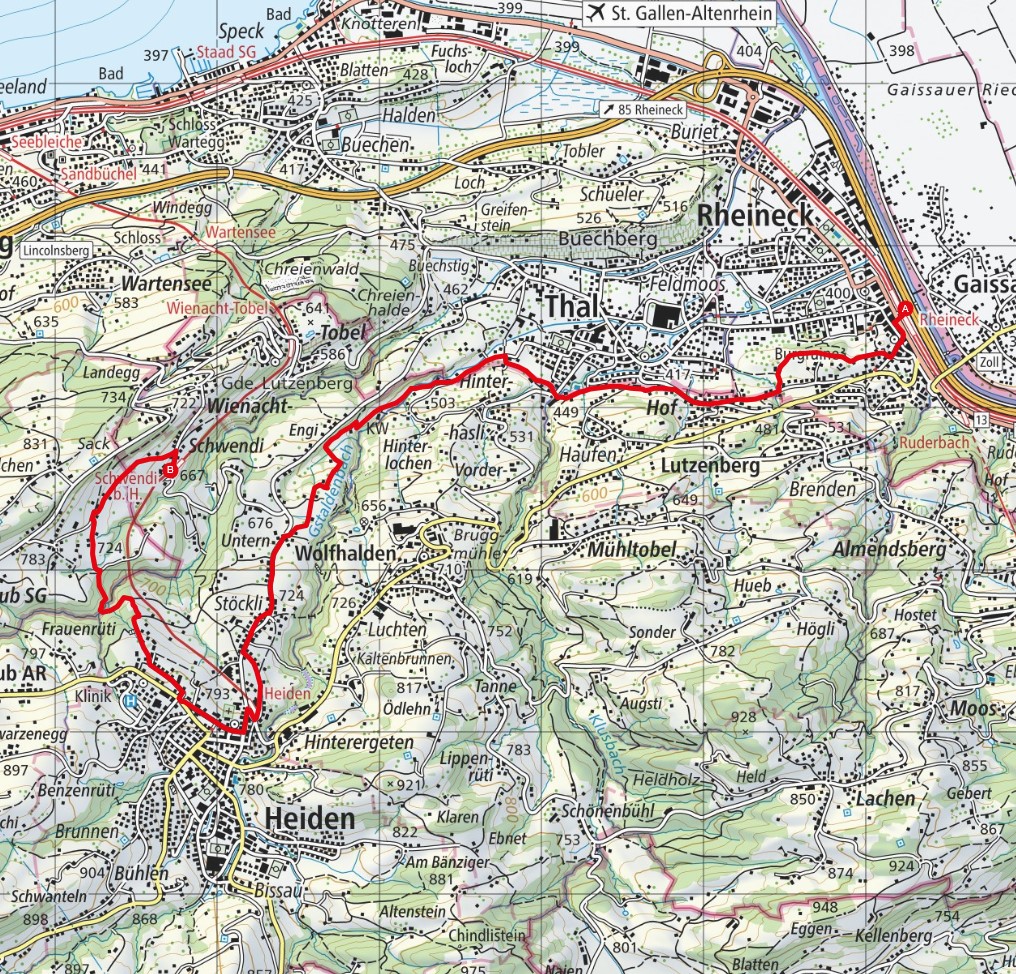 Rheineck - Burgruine Alt Rheienck - Hof - Tobelmüli - Schneegenalp Boden - Gehrn - Unteren - Ober-Unteren - Stöckli - Stapfen - Heiden - Heidentobel - Unterbüel - Unterau - Schwendi b. Heiden