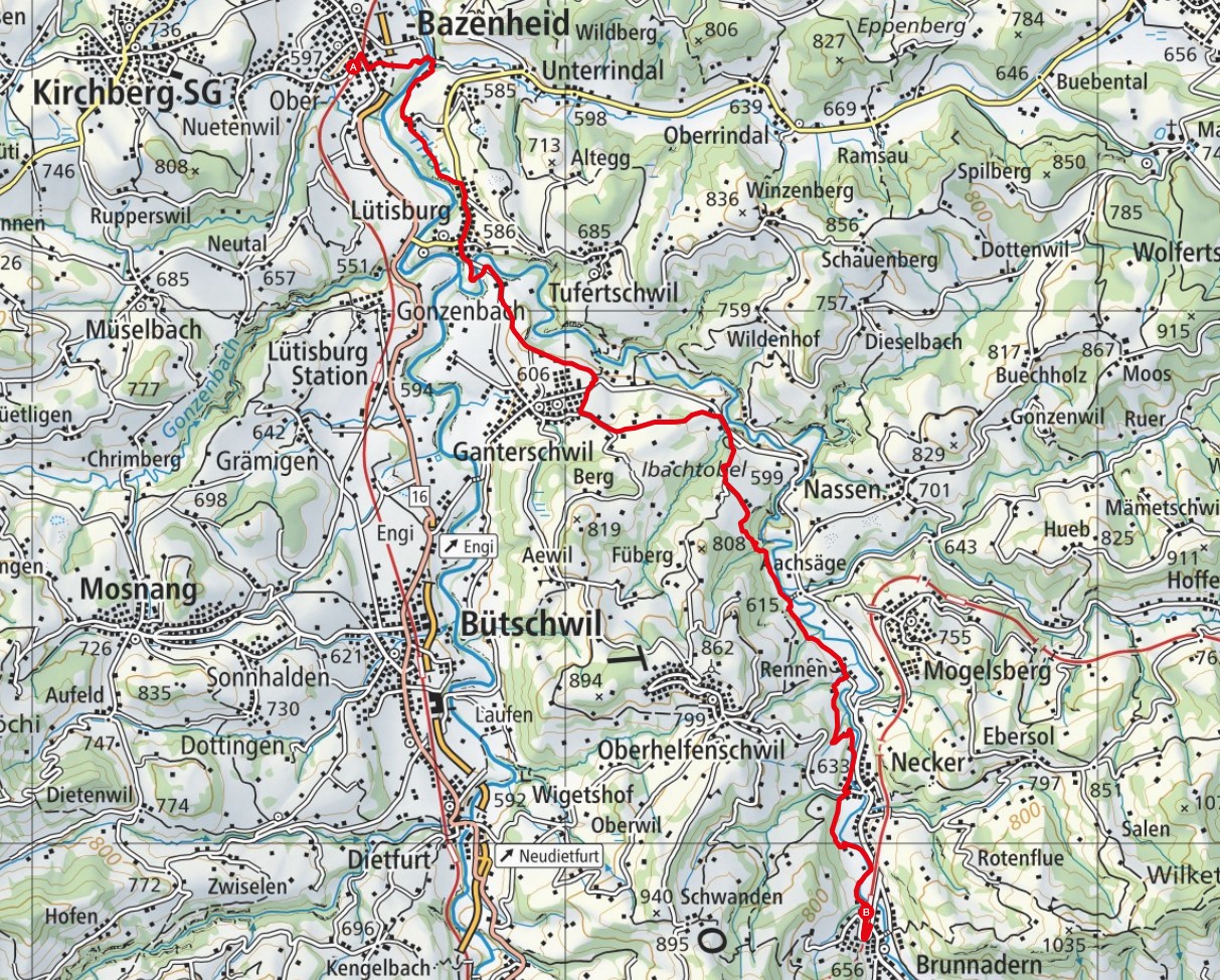 Bazenheid - Mühlau - Lütisburg - Letzi - Ganterswil - Bleiken - Aachsäge - Metzwil - Necker - Adelbach - Brunnadern
