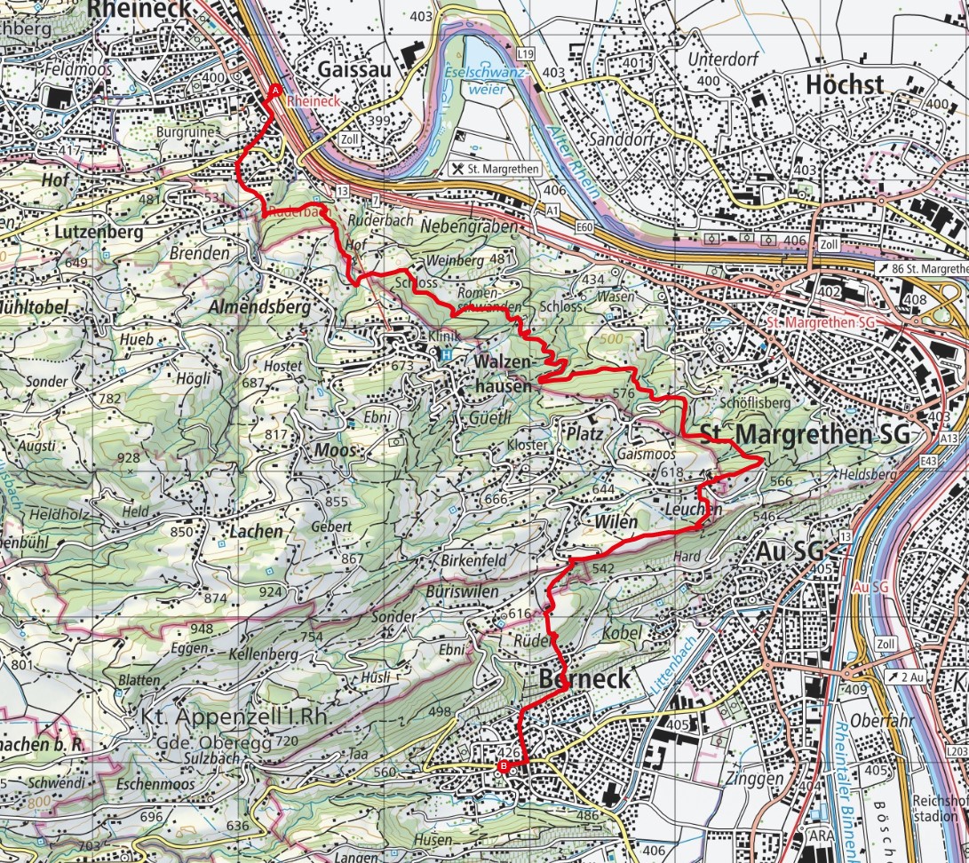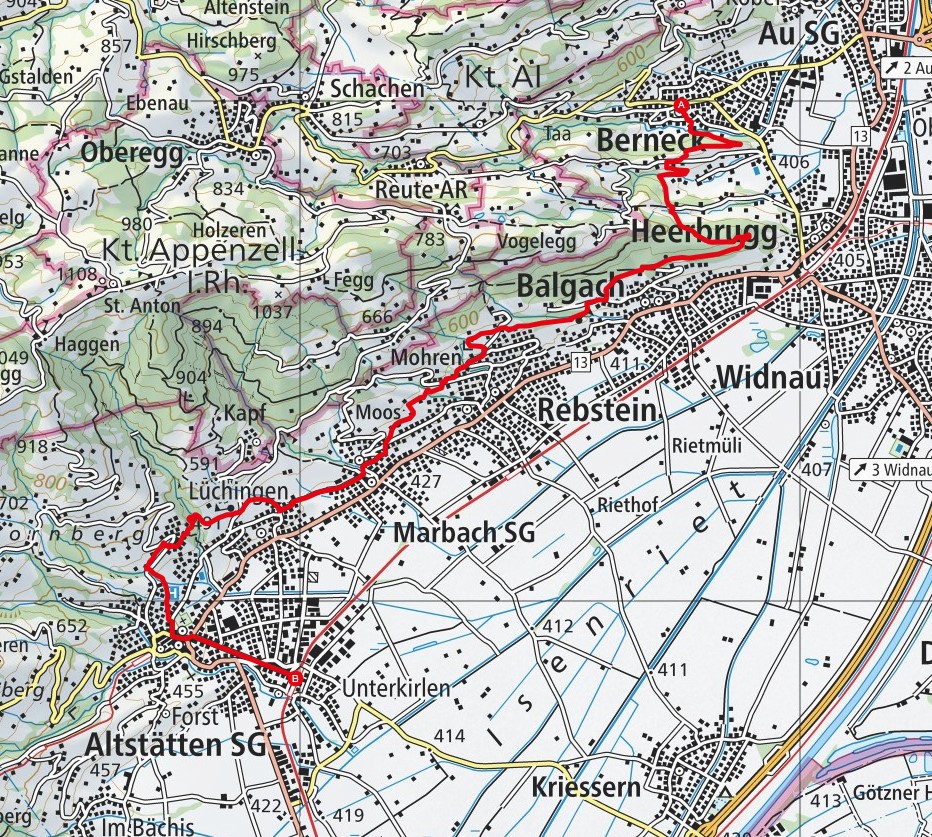 Berneck - Rosenberg - Oberbuechholz - Heerbrugg - Klinneberg - Balgach - Schloss Grünenstein - Rebstein - Hirschelen - Schloss Weinstein - Marbach - Oberlüchingen - Wieswanne - Altstätten