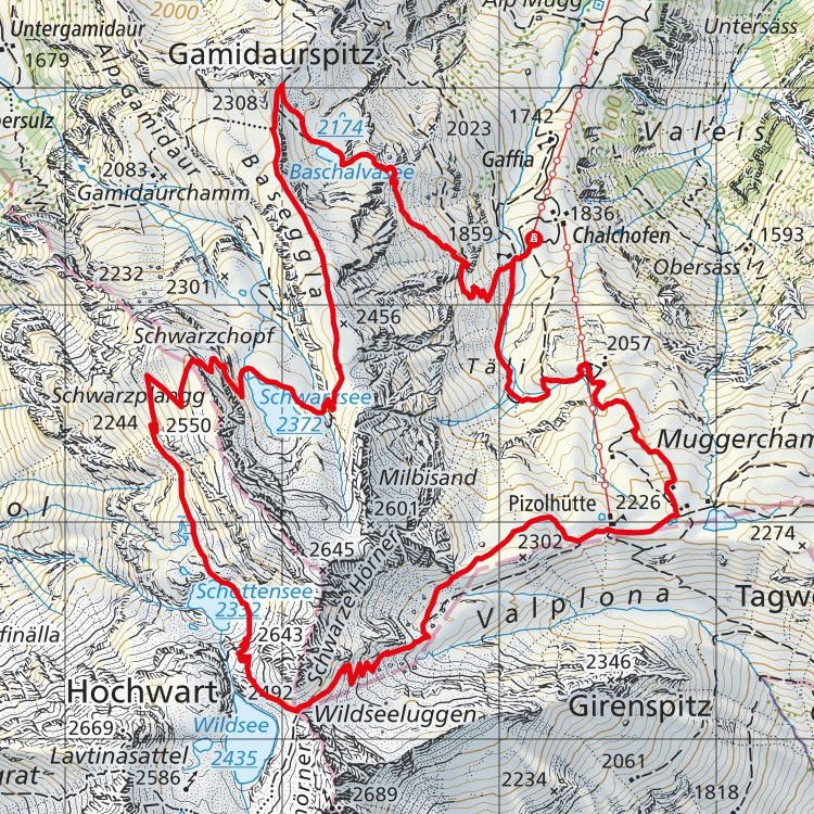 Wangs-Pizol (Gaffia) - Chuetschingel - Baschalvasee - Rossstall - Schwarzsee - Schwarzplangg - Schottensee - Wildsee - Wildseeluggen - Twärchamm - Pizolhütte - Rinderläger - Wangs-Pizol (Gaffia)