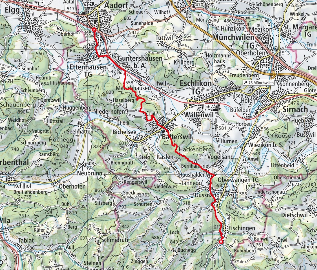 Aadorf - Ettenhausen - Tänikon - Guntershausen - Ebenet - Loh - Balterswil - Hackenberg - Bernhardsriet - Dussnang - Scheidweg - Fischingen