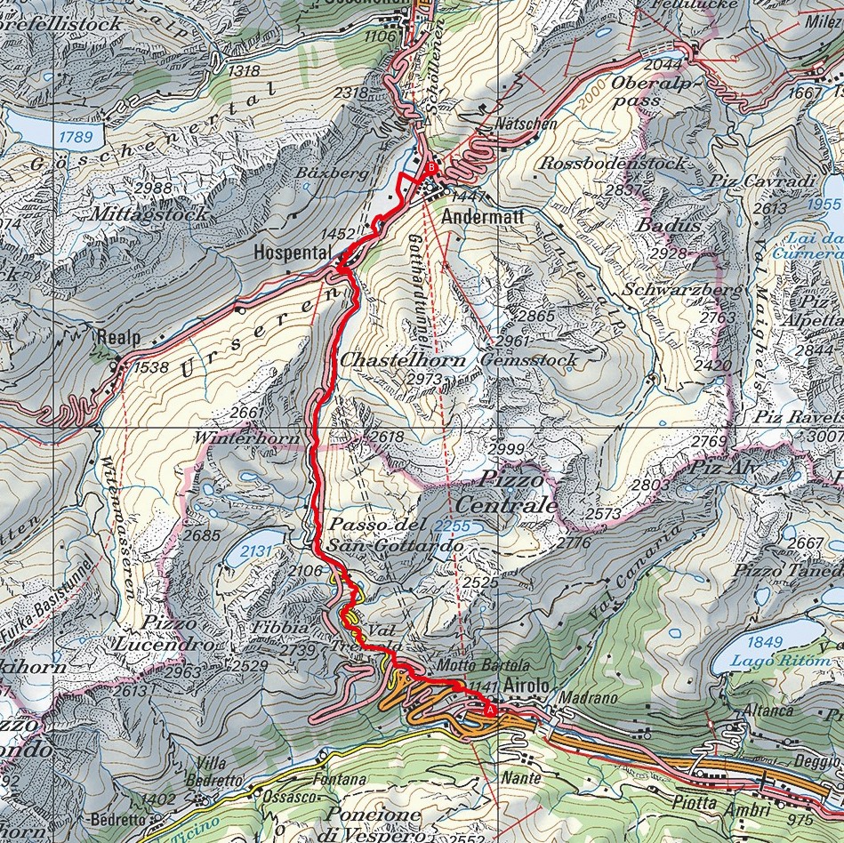 Airolo - Motto Bartola - Motto di Dentro - Ponte di Mezzo - Val Tremola - Ospizio - Gotthardpass - San Carlo - Mätteli - Gamssteg - Hospental - Reussen - Andermatt