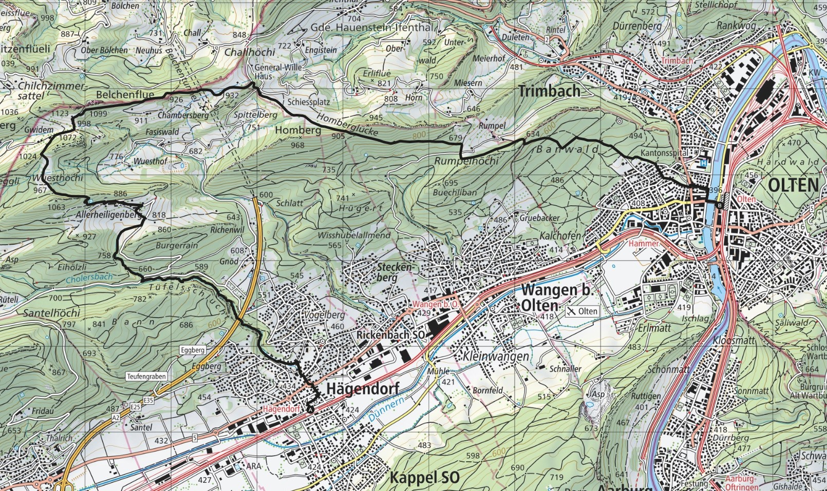 Hauenstein - Ifleter Berg - Challhöchi - Bölcheflue - Wuesthöchi - Asp - Bärenwil - Schlosshöchi - Wishöchi - Tiefmatt - Roggenschnarz - Roggenflue - Chluser Roggen - Balsthal (Thalbrücke)