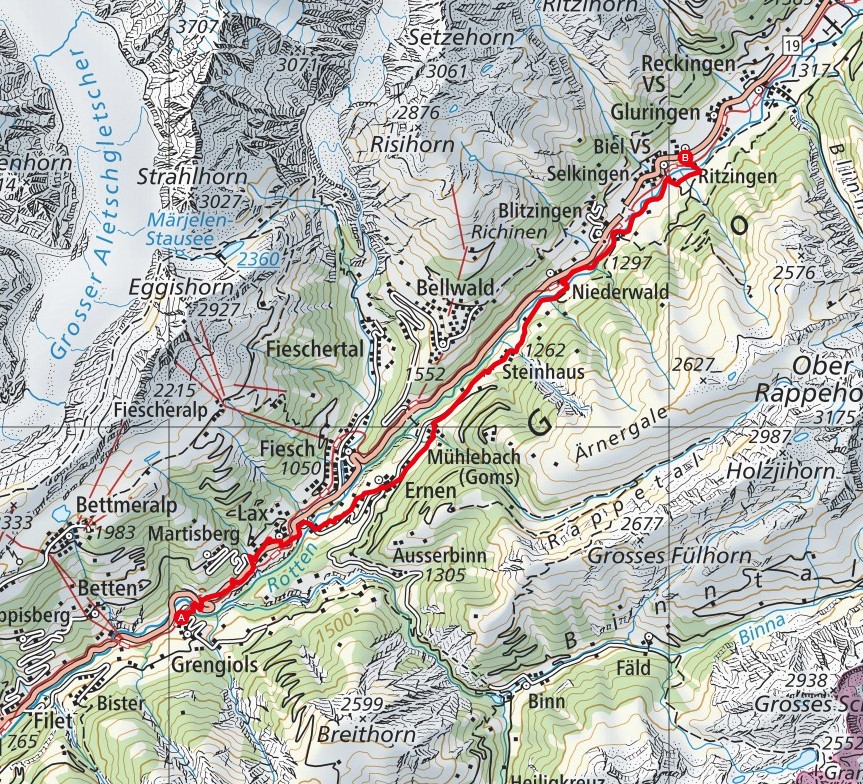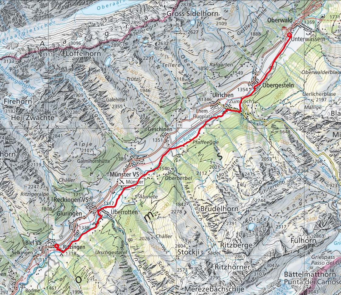 Ritzingen - Gluringen - Reckingen - Überrotten - Münster VS - Geschinen - Hinnermatt - Ulrichen - Zum Loch - Obergesteln - Schweitmatte - Oberwald