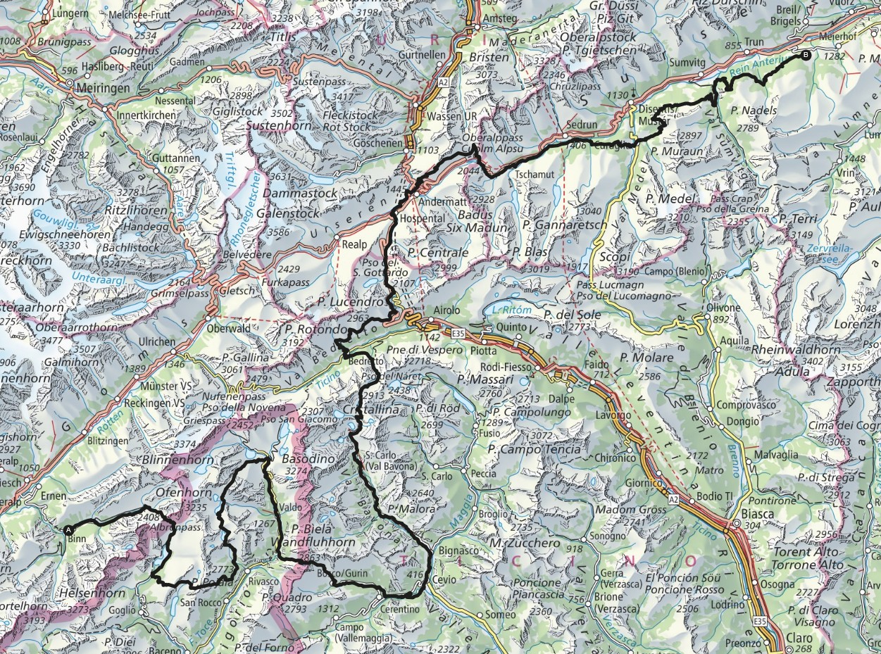 Airolo - Motto Bartola - Motto di Dentro - Ponte di Mezzo - Val Tremola - Ospizio - Gotthardpass - San Carlo - Mätteli - Gamssteg - Hospental - Reussen - Andermatt